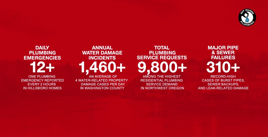 At M.T. Dunn Plumbing, our licensed plumbers serving Hillsboro have witnessed firsthand the growing demand for emergency plumbing services across the Portland metro area. Based on national plumbing industry data, approximately 1 in 60 insured homes files a water damage claim annually, with Oregon ranking as the 2nd highest-paying state for plumbers at $88,912 median salary reflecting the state’s high demand for skilled professionals. With water damage accounting for 28% of all homeowners insurance losses and average claims exceeding $13,954, Hillsboro homeowners face significant risks from plumbing failures that require immediate professional attention.